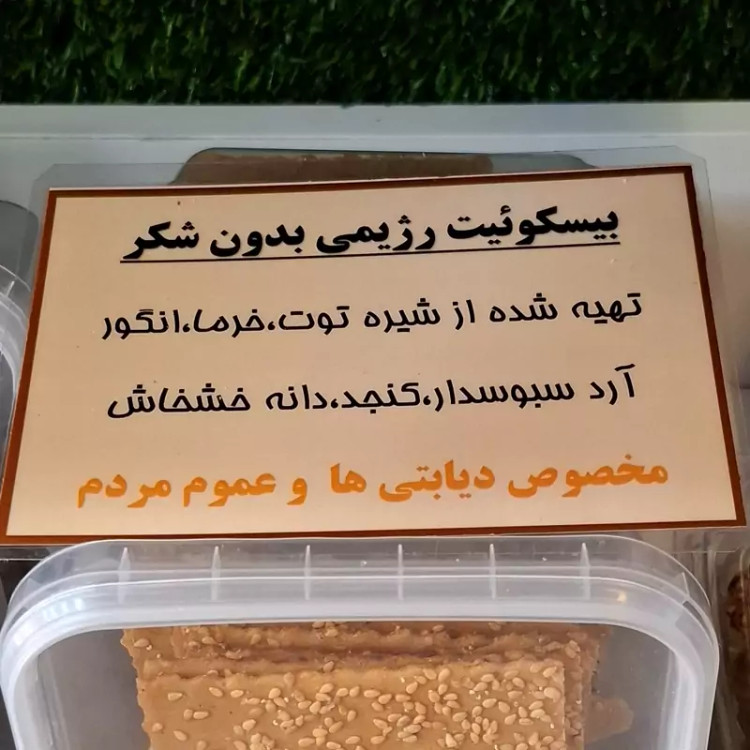 بیسکویت رژیمی که از آرد سبوس دار ، شیره خرما ، شیره انگور ، شیره توت و کنجد تهیه شده بسیار ترد و مقوی مناسب بچه ها و افرادی که رژیم غذایی دارن